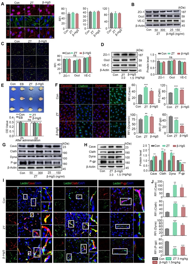通過(guò)細胞蛋白組學(xué)分析結合體內外蛋白驗證,初步證實(shí)金屬制劑主要通過(guò)調節血腦屏障中的轉胞吞作用實(shí)現高效的跨腦遞藥功能。它能夠通過(guò)上調腦微血管中caveolin,clathrin,和 dynamin蛋白的表達促進(jìn)藥物向腦內轉運,同時(shí)顯著(zhù)降低 P-gp的表達,以減少血腦屏障對藥物的外排作用,從而實(shí)現藥物在腦內的高效富集。另外,值得關(guān)注的是,HgS金屬制劑并沒(méi)有引起血腦屏障緊密連接相關(guān)蛋白的表達降低,說(shuō)明它對藥物的入腦作用并不是通過(guò)血腦屏障結構的暫時(shí)性開(kāi)放而實(shí)現的。