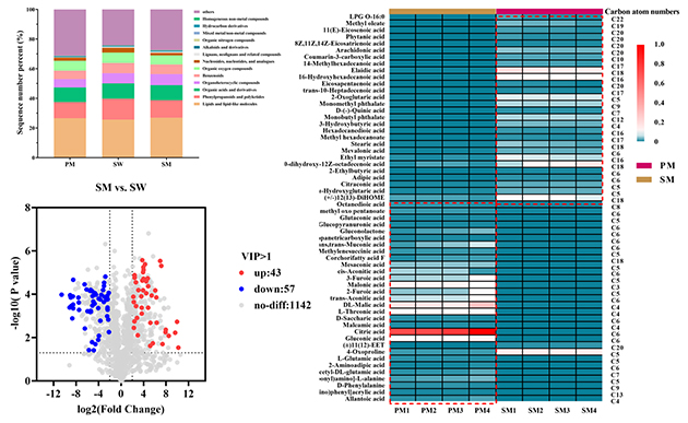 非靶向代謝組學(xué)分析共鑒定出1242種代謝物。在扁蓿豆植株甲醇提取物中,短鏈有機酸及其衍生物的相對豐度較高;根際土壤水提物中富含生物堿和黃酮類(lèi)化合物;而根際土壤甲醇提取物則以長(cháng)鏈有機酸及其衍生物為主。進(jìn)一步發(fā)現,短鏈有機酸、其衍生物以及黃酮類(lèi)化合物可能為與扁蓿豆化感作用相關(guān)的關(guān)鍵候選化感物質(zhì)。