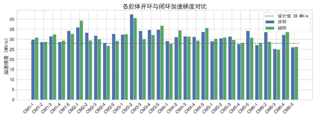 HIAF注入器的超導加速段由6套QWR007型和11套HWR015型加速單元組成。團隊自2024年6月啟動(dòng)QWR型超導腔批量化生產(chǎn),并于2025年6月順利完成了本次在線(xiàn)運行測試。在7?ms脈沖寬度、5?Hz重復頻率的注入器設計工況下,測試平均加速梯度對應的峰值表面場(chǎng)達到31.1?MV/m,較設計值28.0?MV/m高出11%,幅度穩定性?xún)?yōu)于0.04%,相位抖動(dòng)控制在0.08°以?xún)?,滿(mǎn)足運行要求。