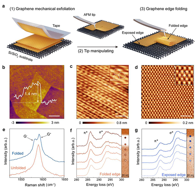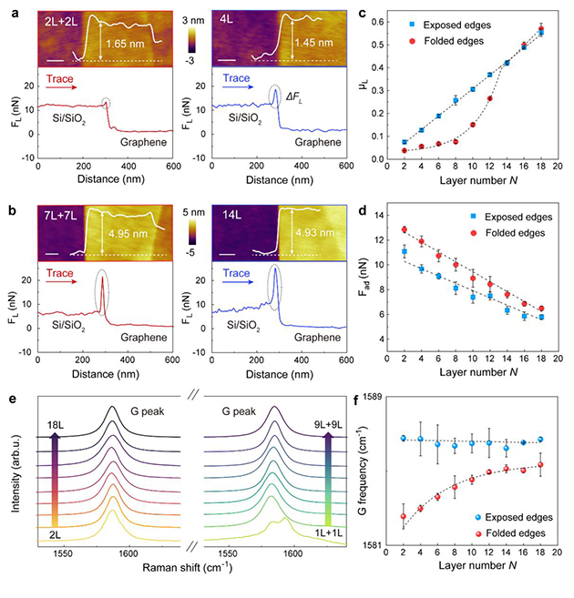 團隊基于原子力顯微鏡納米針尖操縱技術(shù),構筑了具有可控曲率與層數的折疊石墨烯邊緣拓撲結構(圖1),系統開(kāi)展了納米尺度摩擦測量。研究發(fā)現,折疊石墨烯邊緣摩擦力隨層數呈現出顯著(zhù)的非線(xiàn)性變化(圖2),違背了經(jīng)典摩擦定律在固-固界面下的適用性。