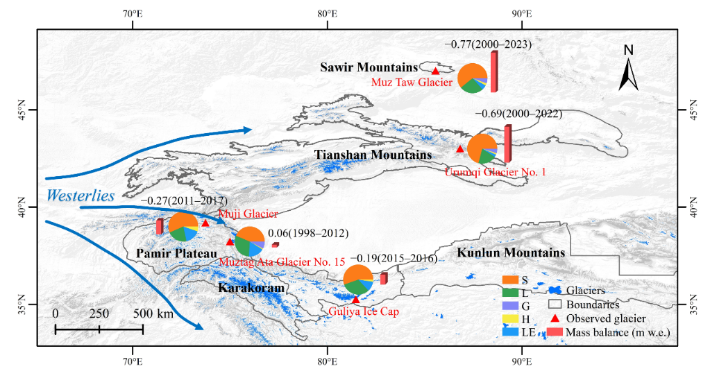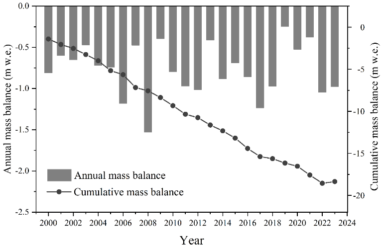 該研究成果以Mass balance reconstruction of a reference glacier in central Asia during 2000–2023: Integrating simulation and in-situ measurements為題發(fā)表于氣候變化領(lǐng)域權威期刊Advances in Climate Change Research。西北研究院王璞玉研究員為論文第一作者和通訊作者。該研究得到國家自然科學(xué)基金、中國科學(xué)院青促會(huì )優(yōu)秀會(huì )員項目、冰凍圈科學(xué)與凍土工程全國重點(diǎn)實(shí)驗室自主部署項目等聯(lián)合資助。