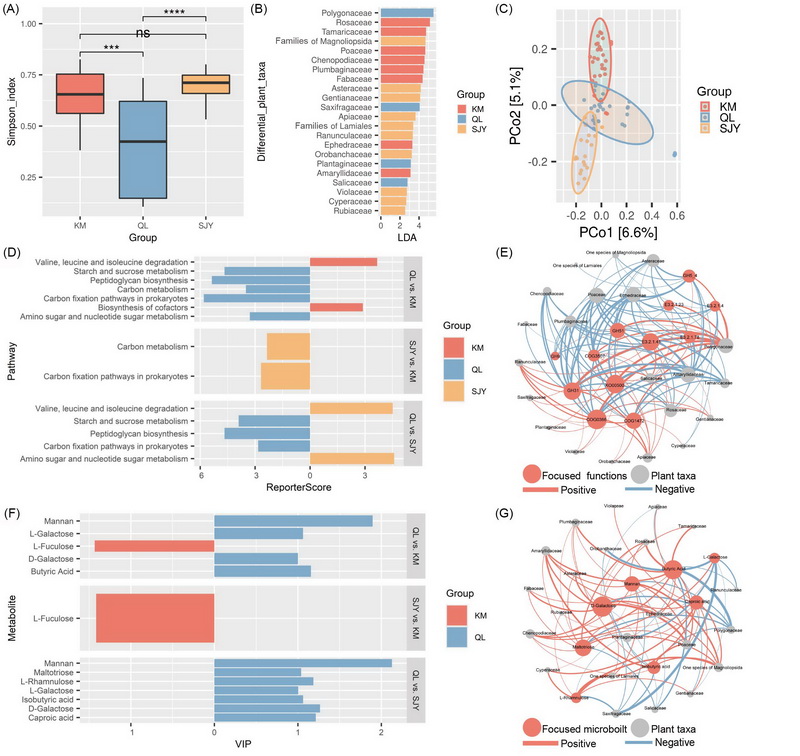 中國科學(xué)院西北高原生物研究所動(dòng)物生態(tài)與資源保護研究團隊在青藏高原青海湖流域、昆侖山及三江源三大典型區域采集了巖羊的新鮮糞便樣本,利用trnL植物DNA條形碼技術(shù)、宏基因組測序技術(shù)和非靶向代謝組學(xué)技術(shù),構建了巖羊食性 - 微生物 - 代謝物多組學(xué)關(guān)聯(lián)分析框架,深入解析了巖羊在青藏高原不同區域的食性差異、腸道微生物組成與功能特征及其代謝產(chǎn)物差異,探索了食性結構與微生物共生系統的協(xié)同變異規律,揭示了宿主 - 微生物共生系統在區域適應中的協(xié)同進(jìn)化模式。
