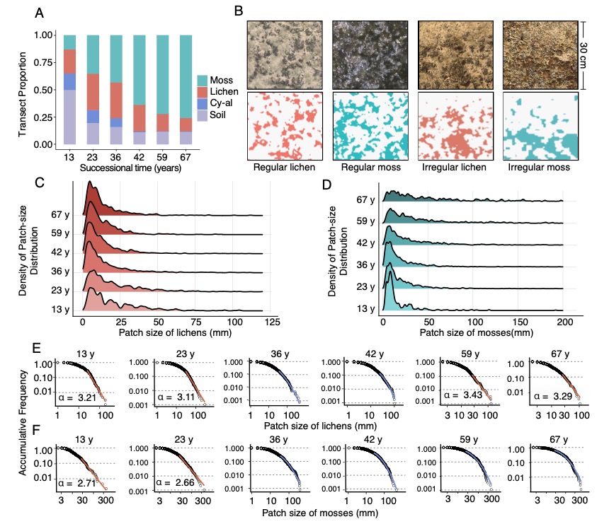 研究團隊采用了計算建模與全局-局部耦合的野外調查相結合的研究方法。理論建?;诟怕实脑詣?dòng)機(Cellular automaton)模型的開(kāi)發(fā),模擬了地衣和蘚類(lèi)斑塊的動(dòng)態(tài)變化。野外觀(guān)測在中國科學(xué)院沙坡頭沙漠試驗研究站進(jìn)行,通過(guò)在不同演替階段的人工固沙植被帶中設置樣線(xiàn),記錄了生物結皮的覆蓋度、組成和斑塊大小分布。研究通過(guò)對冪律分布的擬合,從全局尺度檢測主導生物結皮動(dòng)態(tài)的反饋模式。通過(guò)不同演替階段和不同斑塊大小下生物結皮斑塊中心與邊緣之間的生長(cháng)差異比較,從斑塊尺度驗證局部自組織過(guò)程,對比模擬結果揭示了生物結皮自組織機理及其生態(tài)意義。