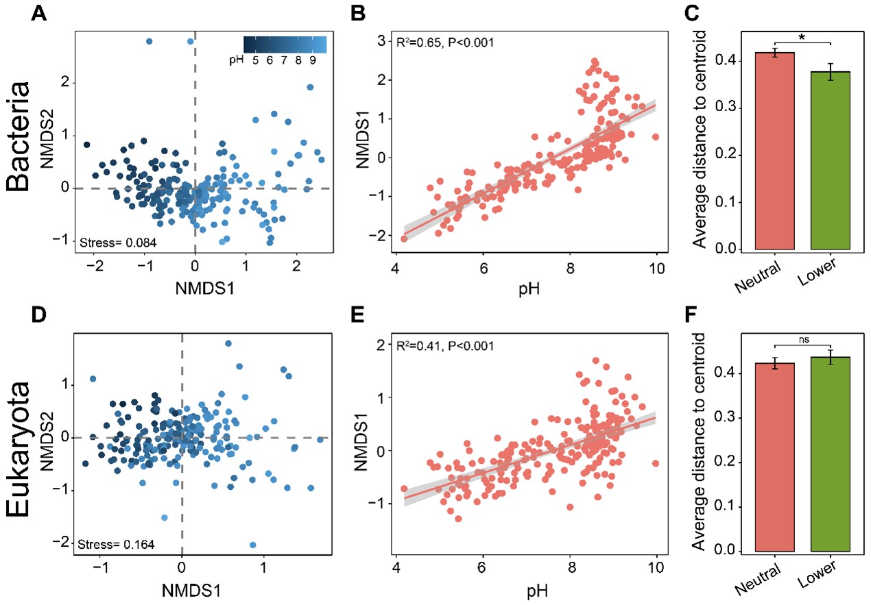 研究表明,以非度量多維尺度分析(NMDS)首軸作為土壤微生物群落組成變化的指標具有科學(xué)依據?;贐ray-Curtis相異距離與Mantel檢驗,確定土壤pH值是影響細菌與真核生物群落組成的關(guān)鍵環(huán)境變量。偏最小二乘路徑模型(PLS-PM)進(jìn)一步顯示土壤pH值對細菌群落呈強正效應,對真核生物群落則為負效應。