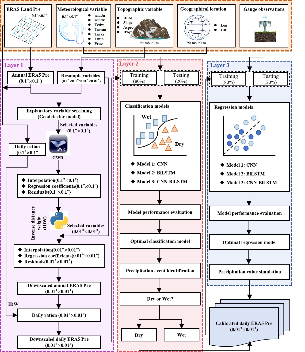 TLIDC技術(shù)框架。TLIDC框架整體分為三部分:降水數據的空間降尺度(表示為L(cháng)ayer 1)、降水事件的識別(表示為L(cháng)ayer 2)和降水量的模擬(表示為L(cháng)ayer 3)。Layer 1通過(guò)GWR模型,提供高空間分辨率的降水數據,Layer 2和Layer 3利用構建的CNN-BiLSTM模型來(lái)提高降尺度后降水數據的準確性