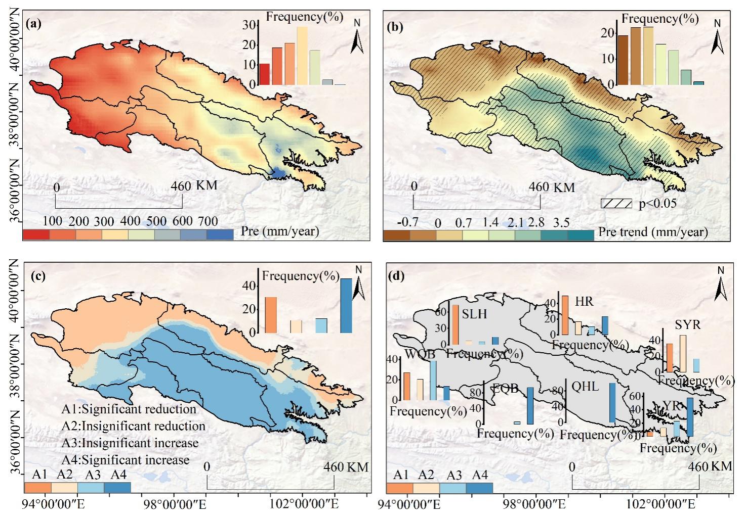 1950-2024年祁連山降水重建結果及時(shí)空變化特征。(a)重建降水的空間分布;(b) Sen’s趨勢估計與Mann-Kendall顯著(zhù)性檢驗結果;(c)祁連山降水時(shí)空變化的趨勢類(lèi)型;(d)各子流域降水時(shí)空變化的趨勢類(lèi)型。
