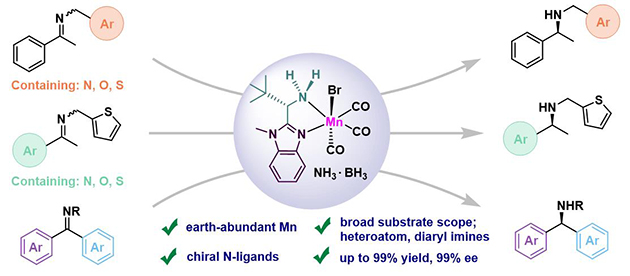 手性胺是重要的有機合成砌塊,在醫藥、農藥和精細化學(xué)品中廣泛應用,碳氮雙鍵(C=N)的不對稱(chēng)(轉移)氫化是制備手性胺最為高效和快捷的方法之一。傳統的不對稱(chēng)(轉移)氫化方法依賴(lài)于貴金屬催化劑和復雜配體。硫(S)、氮(N)、氧(O)是自然界和藥物化學(xué)中重要的雜原子,然而,由于其孤對電子對金屬催化劑的毒化性質(zhì)使得含硫(S)、氮(N)、氧(O)的亞胺化合物和胺類(lèi)化合物難以在眾多貴金屬催化體系中兼容。此外,雙芳基亞胺由于其兩側的芳基具有相似的立體位阻和電子性質(zhì),使得手性催化劑在雙芳基亞胺的不對稱(chēng)還原中存在極大的選擇性識別挑戰。在“雙碳”目標引領(lǐng)下,利用豐產(chǎn)元素代替貴金屬的催化過(guò)程是實(shí)現二氧化碳減排、發(fā)展低碳催化新技術(shù)的重要手段之一,在精細化學(xué)品、制藥領(lǐng)域具有廣泛的應用前景。