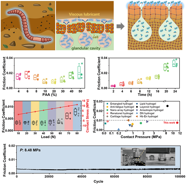 中國科學(xué)院蘭州化學(xué)物理研究所潤滑材料全國重點(diǎn)實(shí)驗室周峰研究員和麻拴紅研究員團隊,受自然界蚯蚓持續潤滑機制啟發(fā),開(kāi)發(fā)了一種基于微量潤滑劑的聚合物凝膠超潤滑材料。