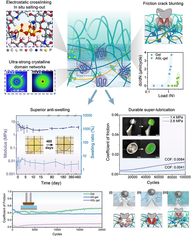 在解決聚合物凝膠材料超高承載和機械魯棒性超潤滑難點(diǎn)基礎之上,研究人員將關(guān)注點(diǎn)轉移到解決材料在苛刻鹽離子介質(zhì)中的長(cháng)效力學(xué)穩定性難題。盡管已報道的大多數聚合物凝膠材料能夠實(shí)現優(yōu)異的承載與減摩功能,但其在復雜離子介質(zhì)中普遍存在溶脹和力學(xué)失效問(wèn)題,摩擦學(xué)評價(jià)往往以去離子水為潤滑介質(zhì),這明顯與聚合物材料的實(shí)際應用工況不符(海水或生理介質(zhì)),使得相關(guān)材料的開(kāi)發(fā)僅僅停留在概念和模型水平。