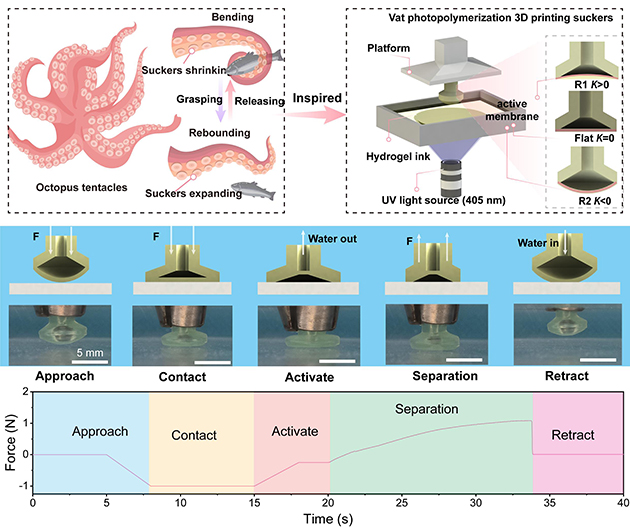 圖1. 受章魚(yú)啟發(fā)的自適應水凝膠吸盤(pán)的設計制造示意圖。