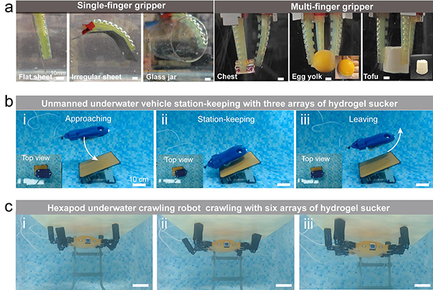 為進(jìn)一步凸顯非破壞性粘附的實(shí)用性,研究人員研制了一款采用液壓驅動(dòng)、配備仿生吸盤(pán)的水凝膠夾持器,可自適應地操縱各種水下物體,不僅能應對曲面復雜的物體,甚至還能溫和處理蛋黃、豆腐塊等極為脆弱的食品。 此外,研究人員將這類(lèi)水凝膠吸盤(pán)陣列結構集成到水下無(wú)人航行器的腹部和六足機器人的足端,從而賦予其水下操控物體、定點(diǎn)停留及表面爬行等特殊功能,為復雜海洋環(huán)境場(chǎng)景中的應用提供了高適形、可逆、低損的粘附手段。