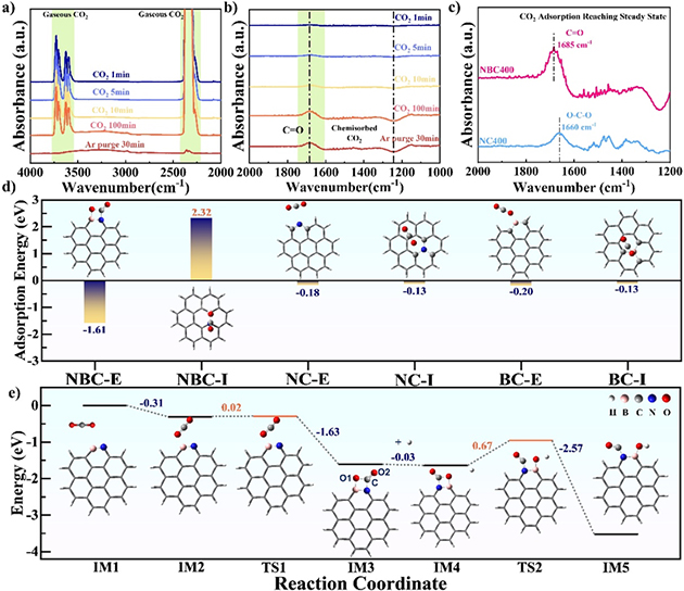 圖2.理論計算結合原位紅外揭示N-B位點(diǎn)活化轉化CO2新機制