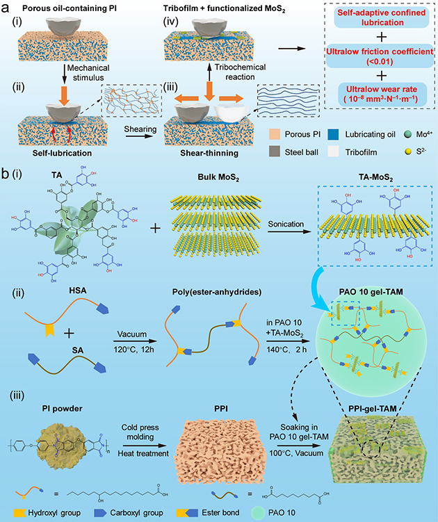 近期,中國科學(xué)院蘭州化學(xué)物理研究所潤滑材料全國重點(diǎn)實(shí)驗室王道愛(ài)研究員團隊基于"自適應限域潤滑"的策略(圖1),設計制備了MoS2-油凝膠復合的多孔聚酰亞胺(PPI-gel-TAM),具有高的儲油能力(18.2%)和油保持率(97.7%),實(shí)現了鋼/PPI界面自適應的宏觀(guān)超潤滑(摩擦系數:~0.007)和超低的磨損率(2.81×10-8·mm3·N-1·m-1),展現出出色的摩擦學(xué)性能,為未來(lái)發(fā)展高性能的工程極限潤滑材料提供了新的見(jiàn)解和思路。