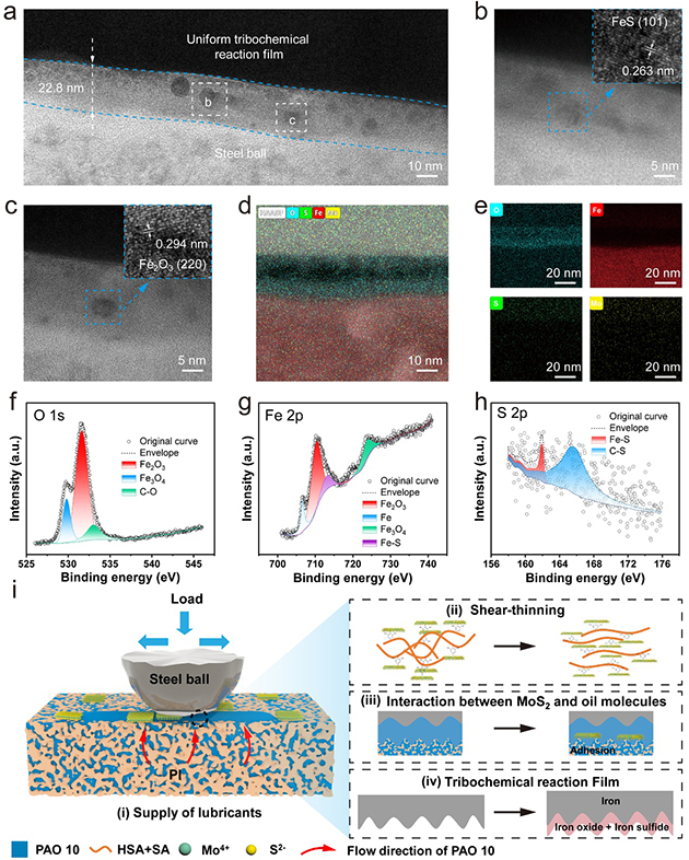 鋼/PPI界面宏觀(guān)超潤滑機理可歸因于四種機制的耦合作用,多孔結構的儲油/釋放、潤滑劑的剪切變稀特性、功能化的二硫化鉬與油分子之間的相互作用以及摩擦保護膜的形成(圖2)。