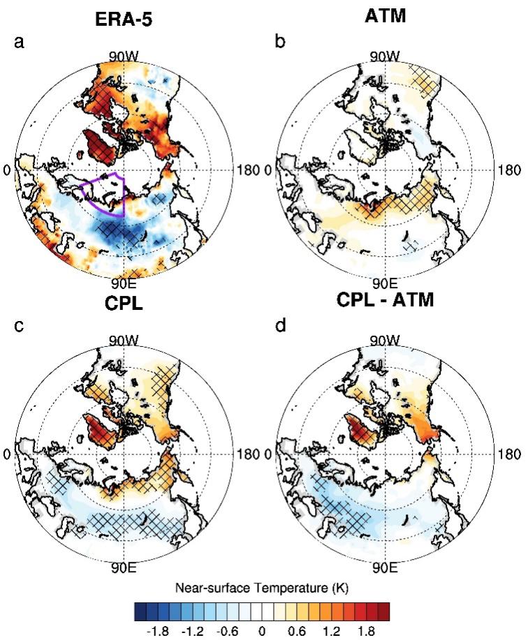 從ERA-5再分析資料(a)、僅考慮大氣過(guò)程的大氣模式試驗(b)及包含海-氣耦合過(guò)程的全耦合模式試驗(c)得到的歷史時(shí)期海冰消融導致的冬季地表氣溫異常(K)。(d)為全耦合模式試驗與大氣模式試驗結果之差