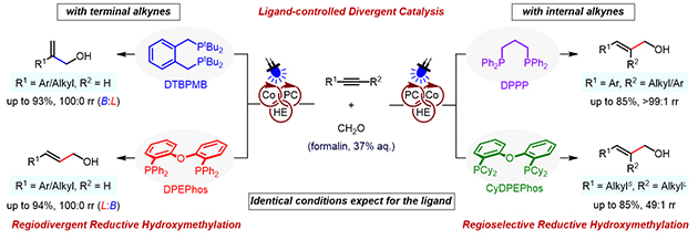 研究人員采用甲醛水溶液作為低成本的C1源,在藍光激發(fā)下,以4CzPN作為光催化劑、CoBr2為金屬催化劑,并借助Hantzsch酯與水作為復合氫源,在室溫條件下實(shí)現了烯丙醇類(lèi)化合物的高效合成。該體系的突出優(yōu)勢在于可通過(guò)配體調控靈活實(shí)現產(chǎn)物結構的多樣化,當使用DTBPMB作為配體時(shí),反應高選擇性地生成支鏈型烯丙醇;而換用DPEPhos配體,則可高效獲得線(xiàn)性烯丙醇產(chǎn)物。此外,若采用DPPP或CyDPEPhos為配體,該催化體系還能以?xún)?yōu)良的選擇性實(shí)現芳基/烷基內炔與甲醛的羥甲基化反應,展現出良好的官能團適應性和合成應用潛力。機理研究表明,該反應經(jīng)歷了低價(jià)鈷物種與甲醛和炔烴發(fā)生氧化環(huán)化,生成氧雜五元環(huán)鈷中間體然后質(zhì)子化的過(guò)程。