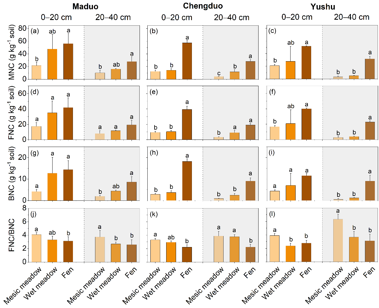 中國科學(xué)院西北生態(tài)環(huán)境資源研究院李玉強研究員團隊,在青藏高原沿高寒草甸-濕地連續體設置了27個(gè)采樣點(diǎn),通過(guò)測定氨基糖等指標,系統揭示了水文變化對土壤微生物殘體碳和顆粒有機碳積累及其對土壤有機碳貢獻的影響。