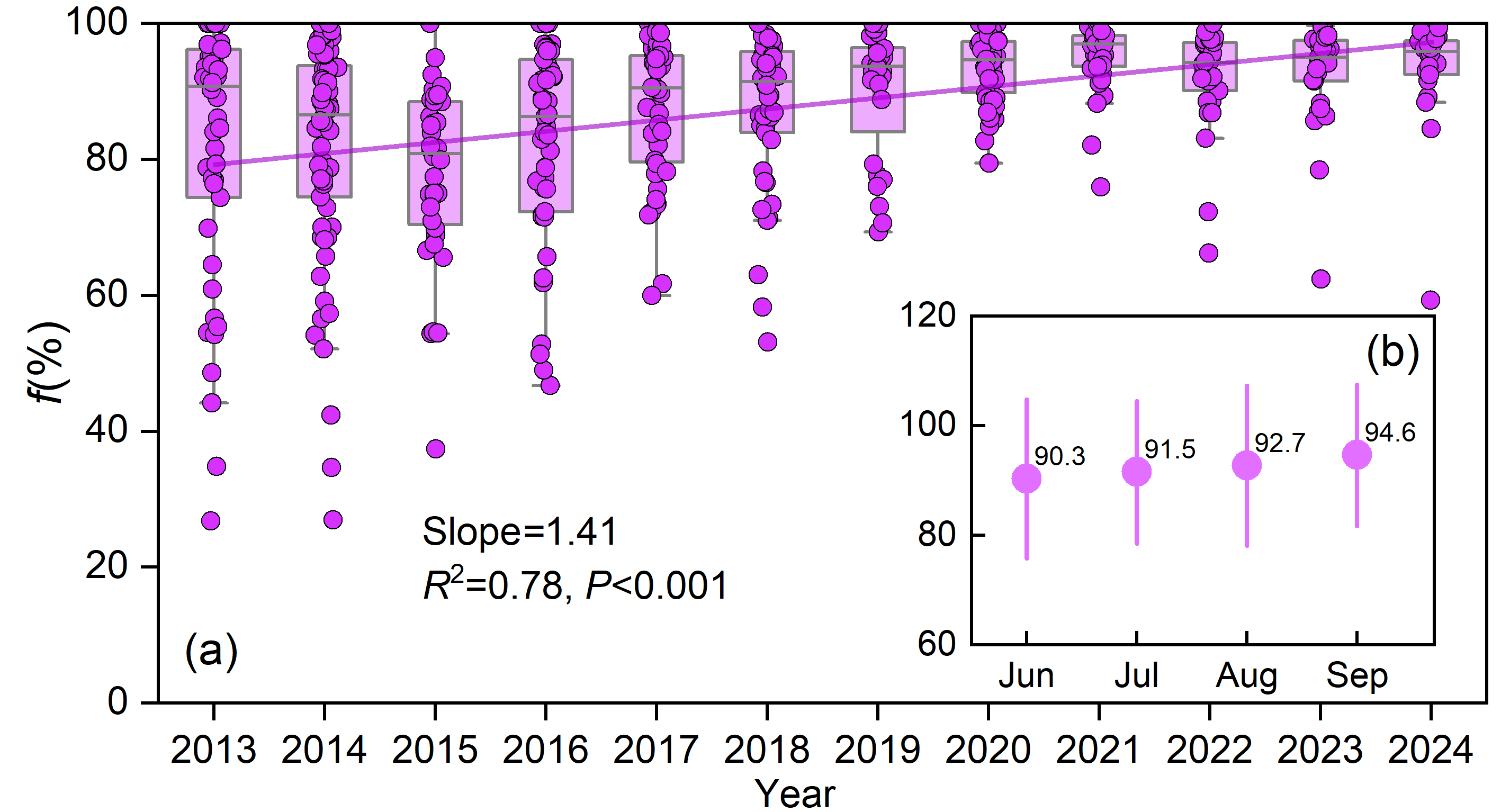 2013至2024年研究區剩余雨滴組分的時(shí)間變化趨勢(a) 年際變化(b) 月度變化