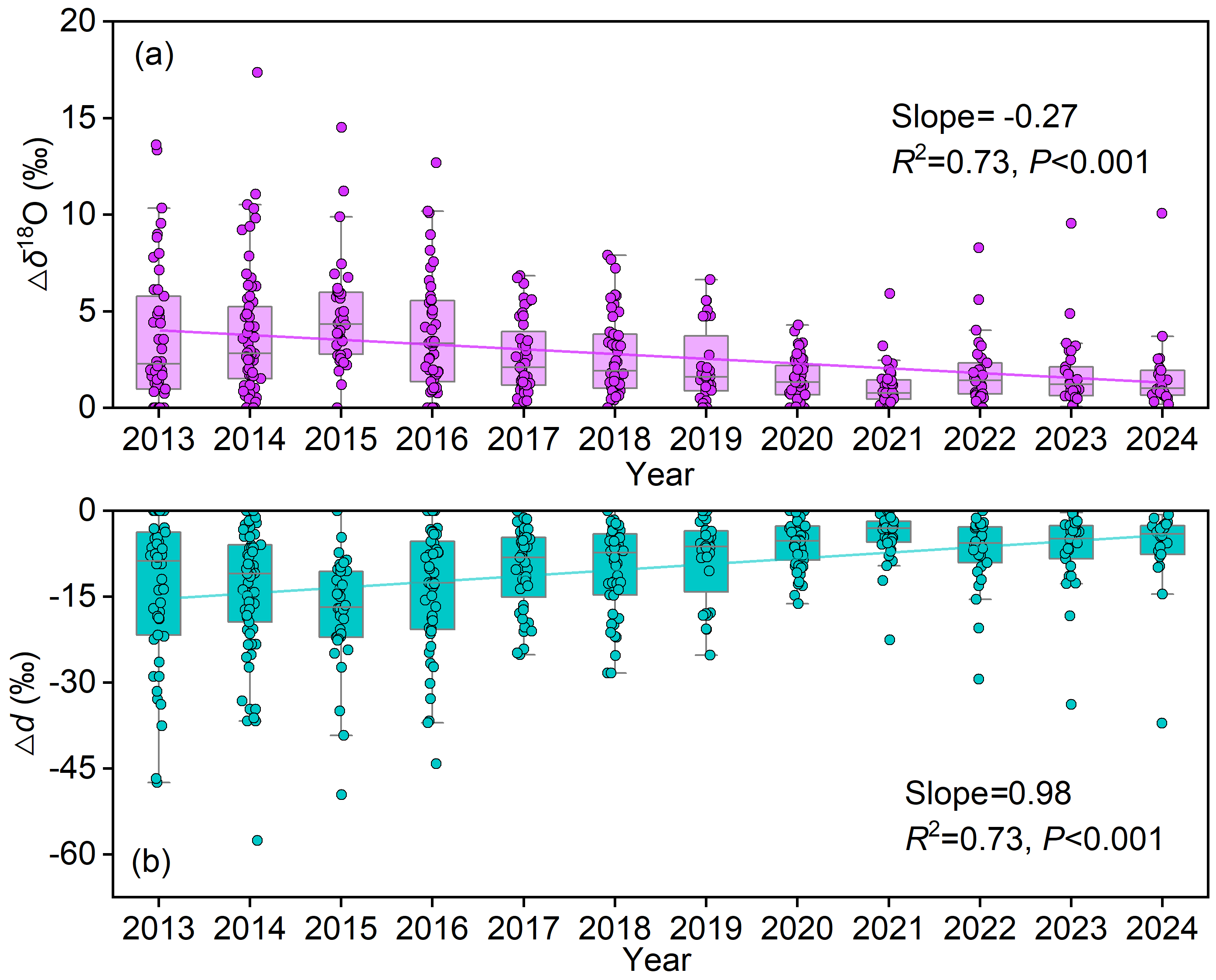 2013至2024年降水從云底到地面的δ1?O和d-excess變化量(Δδ1?O和Δd)的年際趨勢