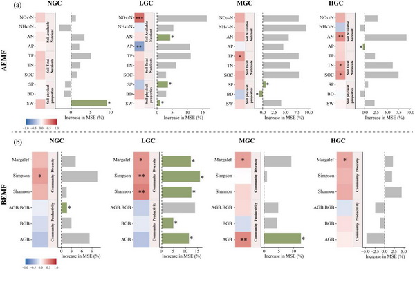 圖1?不同礫石化水平下AEMF與BEMF的相關(guān)性及主要驅動(dòng)因子重要性分析