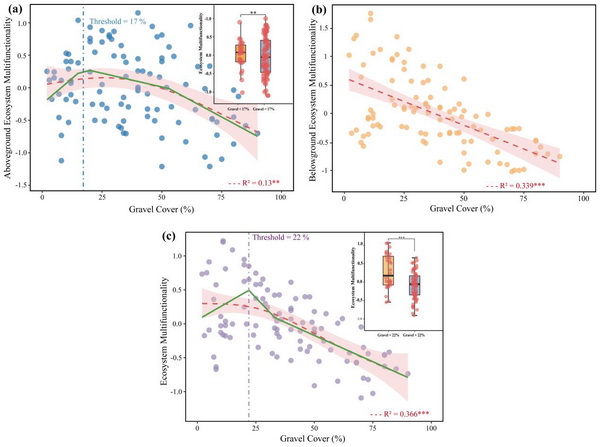 研究發(fā)現,隨著(zhù)礫石覆蓋度的增加,草地植物物種豐富度、功能群組成及生物量顯著(zhù)下降,尤其是地下生物量的減少最為明顯;土壤含水量、孔隙度及養分含量顯著(zhù)降低,而容重顯著(zhù)升高,導致生態(tài)系統整體功能衰退。礫石化不僅直接抑制植物生長(cháng),還通過(guò)削弱土壤養分供給間接降低生態(tài)系統多功能性。隨機森林與結構方程模型分析進(jìn)一步揭示,土壤養分和植物多樣性是決定生態(tài)系統多功能性的關(guān)鍵調控因子。隨礫石化程度加劇,地上功能指數(AEMF)和地下功能指數(BEMF)均顯著(zhù)下降,后者的響應更為敏感,當礫石覆蓋度超過(guò)22%時(shí),生態(tài)系統多功能性(EMF)出現明顯突變性下降,表明該閾值可作為高寒草地退化的早期預警指標。研究指出,高寒草地礫石化退化過(guò)程會(huì )破壞植物-土壤耦合關(guān)系,導致生態(tài)功能的同步退化。
