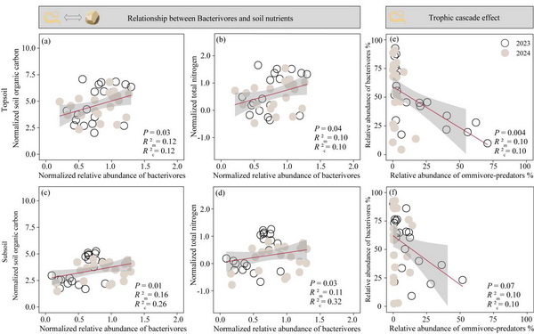 研究發(fā)現,多年凍土區草地退化降低了土壤食細菌線(xiàn)蟲(chóng)的相對豐度,但增加了食草線(xiàn)蟲(chóng)和雜食-捕食線(xiàn)蟲(chóng)的相對豐度,改變了線(xiàn)蟲(chóng)營(yíng)養類(lèi)群的組成。進(jìn)一步分析發(fā)現線(xiàn)蟲(chóng)營(yíng)養類(lèi)群通過(guò)不同的營(yíng)養級聯(lián)反應以及影響植物生長(cháng)來(lái)影響SOC和TN,線(xiàn)蟲(chóng)群落的變化能解釋SOC 變異性的 16.01% - 17.49% 以及 TN 變異性的 10.28% - 15.42%。盡管這些線(xiàn)蟲(chóng)影響相對于植物輸入而言是次要的,但它們仍突顯了線(xiàn)蟲(chóng)群落在土壤養分循環(huán)中的重要性。研究結果闡明了多年凍土區高寒草地退化過(guò)程中土壤線(xiàn)蟲(chóng)營(yíng)養群的響應規律及其介導碳氮循環(huán)的生態(tài)機制,為理解凍土退化下的土壤碳氮動(dòng)態(tài)變化提供了新視角,也為預測未來(lái)氣候變化下高寒草地土壤養分穩定性提供了一定參考。