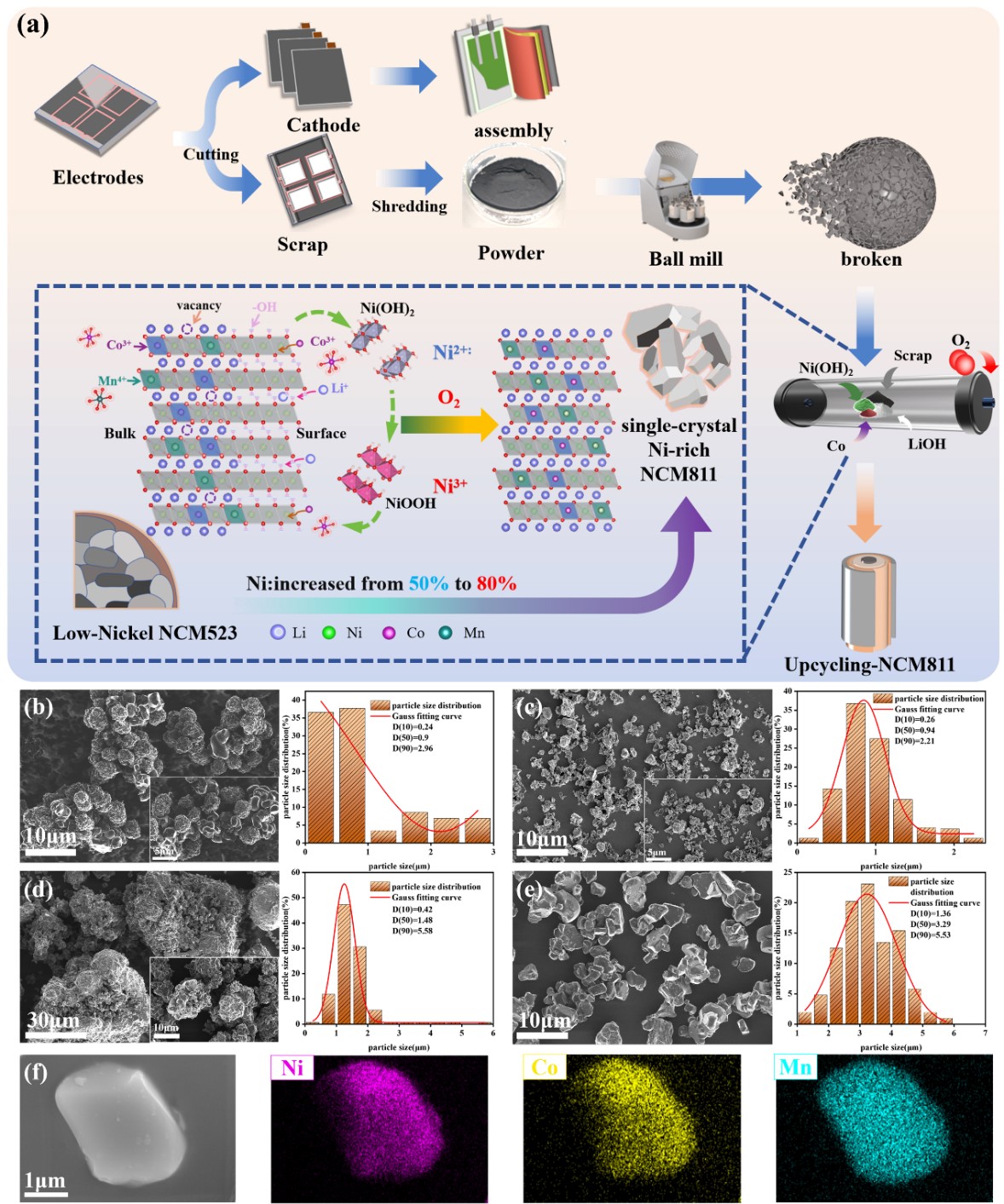 近日,中國科學(xué)院青海鹽湖研究所相變儲能課題組李翔副研究員提出一種針對低鎳、異質(zhì)三元正極混合廢料(如NCM523)的修復再生技術(shù),成功將其轉化為鎳梯度分布的單晶NCM811正極材料,實(shí)現了廢料的高值化利用與性能超越。該研究系統揭示了三元正極混合廢料在修復再生過(guò)程中的動(dòng)態(tài)重構路徑。研究發(fā)現,由于混合廢料中不同尺寸顆粒在空氣中存儲時(shí)失效程度存在顯著(zhù)差異,尤其是小粒徑顆粒更易受到空氣侵蝕,造成更深層次的晶格鋰損失和鹽巖相變,這為直接再生帶來(lái)巨大挑戰。團隊創(chuàng )新性地采用“簡(jiǎn)單機械球磨+雙過(guò)渡金屬補償”相結合的策略,無(wú)需嚴苛條件與原料均一性要求,即可將來(lái)源多樣、粒徑不一的NCM523混合廢料,修復再生為富鎳單晶NCM811正極材料。研究結果表明,該再生單晶NCM811材料展現出卓越的電化學(xué)性能:在0.1C倍率下比容量高達202 mAh/g;在1C倍率下循環(huán)200次后容量保持率達到80.7%,剩余容量超過(guò)145 mAh/g;即便在5C高倍率下循環(huán)200次,容量保持率仍保持在79.4%以上,其倍率性能與循環(huán)穩定性?xún)?yōu)于市售商用單晶NCM811材料。同時(shí),該材料有效抑制了H?→H?相變,進(jìn)一步提升了材料結構穩定性和電池安全性。