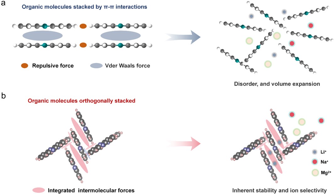針對高容量有機小分子電極因離子插層體積膨脹導致結構坍塌失穩的科學(xué)挑戰,研究團隊開(kāi)創(chuàng )性地提出基于分子間作用力網(wǎng)絡(luò )構筑穩定晶體結構的新思路。以吩嗪為模型體系,研究證實(shí)正交垂直的分子堆疊方式可形成強分子間作用力網(wǎng)絡(luò )和具有離子選擇性的納米孔道。該結構不僅能有效抑制體積膨脹帶來(lái)的機械失效問(wèn)題,同時(shí)其產(chǎn)生的親鋰孔道在原子尺度對單價(jià)金屬離子(Li)具有優(yōu)先傳輸與選擇性性能,選擇性提鋰容量高達109 mg/g。該工作原創(chuàng )性地揭示了分子堆疊微結構與電極材料的宏觀(guān)電化學(xué)穩定性和離子選擇性之間的內在物理化學(xué)規律,為設計新一代兼具高穩定性、高選擇性、高通量的有機電化學(xué)離子捕獲材料奠定了重要理論基礎。
