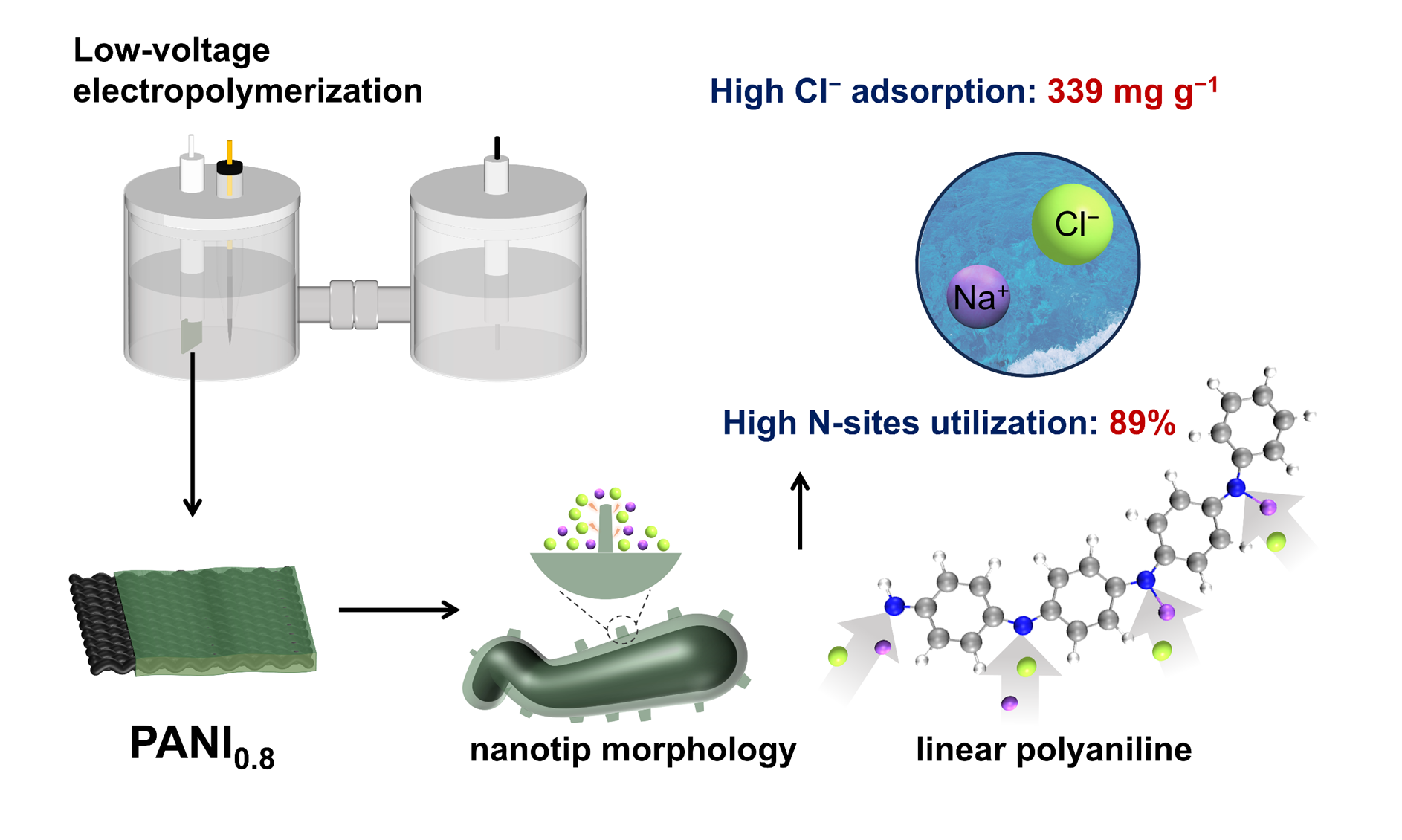 在鹵水資源電化學(xué)提取過(guò)程中,需兼顧電中性原則,因此高效提取伴生陰離子同樣重要。聚苯胺(PANI)憑借優(yōu)異的導電性和可逆摻雜特性,廣泛應用于能源存儲、環(huán)境凈化和離子分離等領(lǐng)域。然而,傳統PANI因氮活性位點(diǎn)利用率低、微宏觀(guān)構效關(guān)系不明確等問(wèn)題,限制了其在高性能電化學(xué)脫鹽中的應用。研究團隊創(chuàng )造性發(fā)現聚合電位是調控其微觀(guān)結構(如聚合度、鏈結構、缺陷類(lèi)型)的關(guān)鍵參數。通過(guò)原位電化學(xué)光譜等手段論證,采用“低電位”策略可有效抑制偶聯(lián)副反應,制備出含納米尖端的低聚度線(xiàn)性結構聚苯胺。該獨特結構顯著(zhù)提升了含氮位點(diǎn)的暴露效率和可接近性:實(shí)現突破性高容量氯離子吸附(Cl容量達339 mg/g)和鈉離子吸附(142 mg/g)。該工作顯著(zhù)推動(dòng)了結構可控聚合物的設計及其在電化學(xué)分離中的應用。