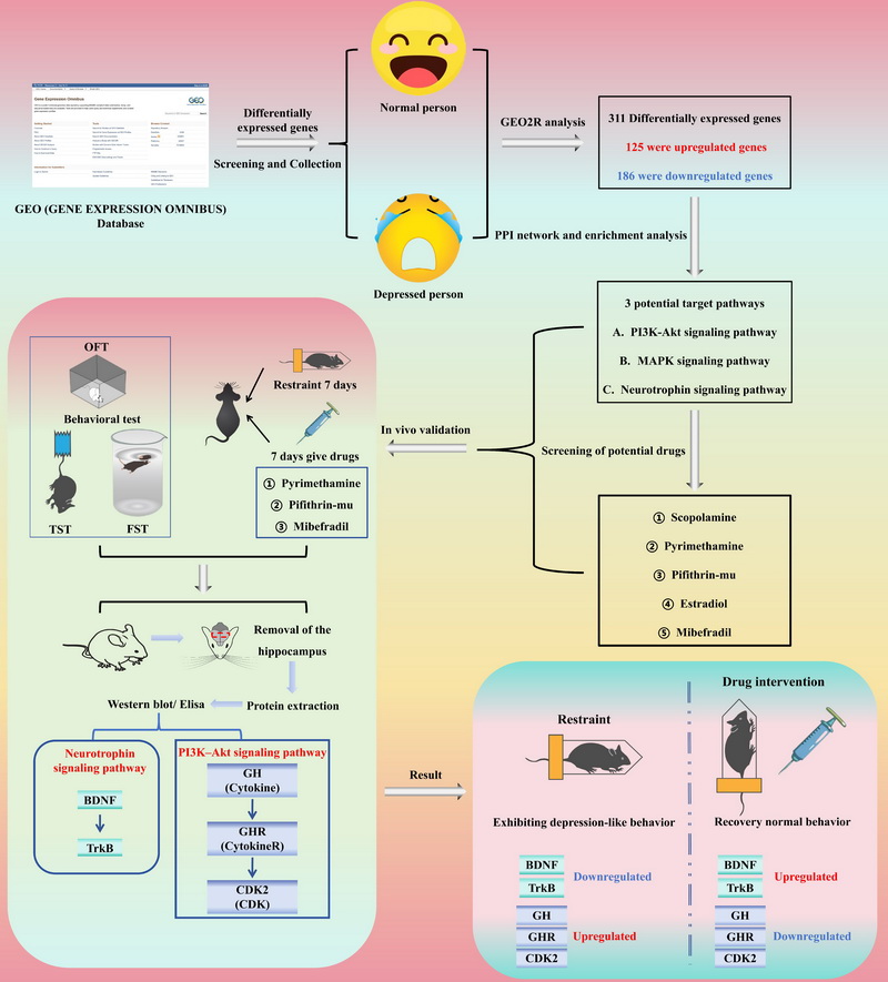 中國科學(xué)院西北高原生物研究所高原藏藥資源質(zhì)控與藥理毒理評價(jià)研究團隊以抑郁癥患者基因表達數據為基礎,先從GEO數據庫篩選出311個(gè)差異表達基因,經(jīng)加權基因共表達網(wǎng)絡(luò )分析、蛋白 - 蛋白相互作用網(wǎng)絡(luò )構建及通路富集分析,發(fā)現這些基因主要富集于 PI3K-Akt、MAPK 和神經(jīng)營(yíng)養因子三大與抑郁癥發(fā)病相關(guān)的信號通路;隨后利用第二代 CMAP 平臺,結合文獻調研篩選出3種候選小分子化合物(pyrimethamine,pifithrin-mu,mibefradil),通過(guò)分子對接實(shí)驗驗證,它們與上述通路關(guān)鍵蛋白(如 CDK2、TrkB 等)親和力高,部分滿(mǎn)足 “強結合” 標準(≤-7 kcal/mol);接著(zhù)在慢性束縛應激小鼠模型中驗證 pyrimethamine,pifithrin-mu,mibefradil的抗抑郁效果,行為學(xué)測試(曠場(chǎng)試驗、強迫游泳試驗、懸尾試驗)顯示三者能顯著(zhù)改善小鼠抑郁樣行為,效果與氟西汀相當;機制研究通過(guò) Western blot 與 ELISA 實(shí)驗證實(shí),三者可調控 PI3K-Akt 和神經(jīng)營(yíng)養因子通路關(guān)鍵蛋白表達(降低 GH、GHR、CDK2 異常高表達,上調 BDNF、TrkB 表達),Pearson 相關(guān)性分析驗證了通路調控與抗抑郁效果的直接關(guān)聯(lián),同時(shí)該研究還證實(shí) “老藥新用” 策略在抗抑郁藥物研發(fā)中的高效性,并建立 “多數據庫整合 - 多組學(xué)分析 - 體內外驗證” 的框架,成功挖掘出 3 種具有抗抑郁潛力的小分子化合物,為抑郁癥治療提供新候選藥物及作用機制參考。