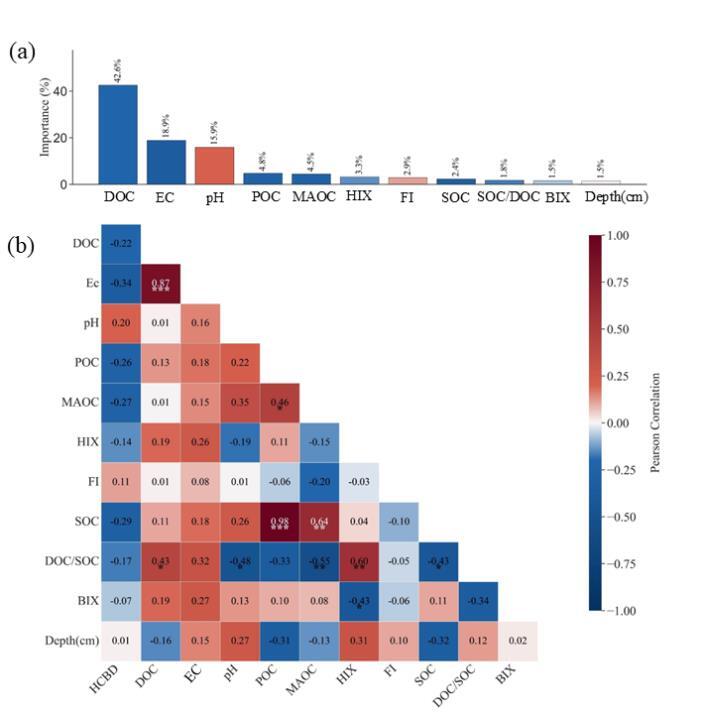 環(huán)境因子與HCBD濃度關(guān)系的隨機(jī)森林模型結(jié)果及相關(guān)性分析。(a)隨機(jī)森林模型中各環(huán)境變量的特征重要性,按其對(duì)HCBD濃度預(yù)測的貢獻(xiàn)度排序。(b)HCBD與環(huán)境因子的Pearson相關(guān)矩陣;紅色和藍(lán)色方框分別表示正相關(guān)和負(fù)相關(guān)。