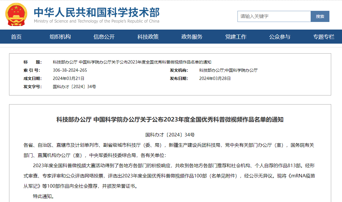 據悉,2023年度全國科普微視頻大賽共收到各地方各部門(mén)推薦和社會(huì )機構、個(gè)人自薦的作品813部,經(jīng)形式審查、專(zhuān)家評審和公眾評選網(wǎng)絡(luò )投票,評選出2023年度全國優(yōu)秀科普微視頻作品100部。