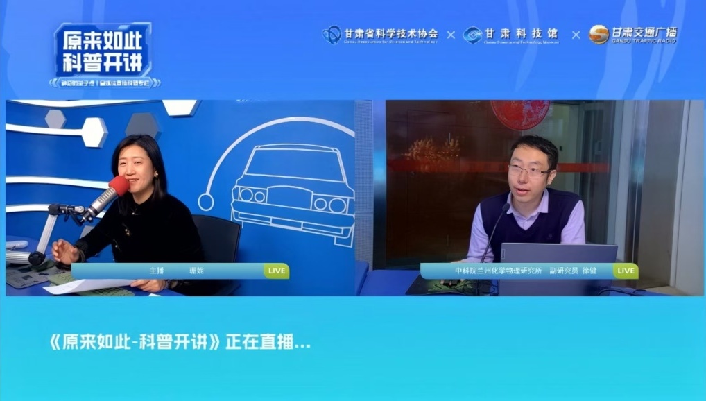12月13日,中國科學(xué)院蘭州化學(xué)物理研究所徐健副研究員受邀在甘肅交通廣播《原來(lái)如此—科普開(kāi)講》欄目開(kāi)展了線(xiàn)上直播科普講座。