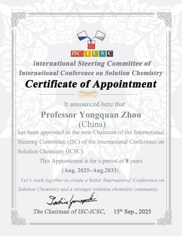9月15日,在突尼斯舉辦IUPAC國際溶液化學(xué)會(huì )議(International Conference on Solution Chemistry)期間,青海鹽湖所周永全研究員當選為該會(huì )議國際指導委員會(huì )(International Steering Committee)新任主席。