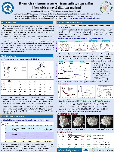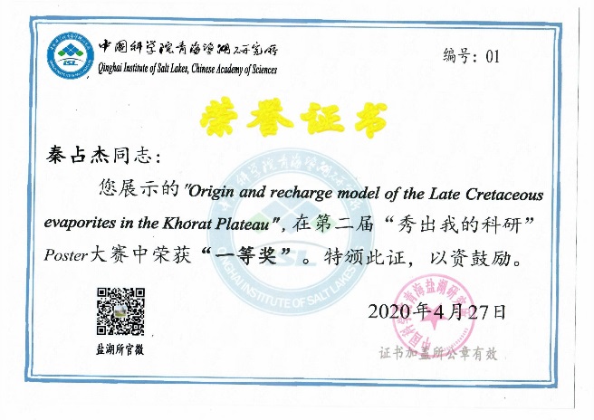 經(jīng)過(guò)專(zhuān)家評審和網(wǎng)絡(luò )投票,最終秦占杰博士《Origin and recharge model of the Late Cretaceous evaporites in the Khorat Plateau》和彭嬌玉博士《Research on Boron Recovery from Sulfate-type Saline Lakes with a Novel Dilution Method》,王廣國同學(xué)《Structure Study of Aqueous CaCl2 Solutions by Molecular Dynamics Simulations》和高靖易同學(xué)《Prehistoric human Activity and its Environmental Background in Lake Donggi Cona Basin, Northeastern Tibetan Plateau》分別斬獲大賽職工組和研究生組一等獎;高春亮博士等6名同志獲得二等獎,孫艷霞博士等10名同志獲得三等獎,本屆大賽為獲獎?wù)咴O計了精美的證書(shū)。