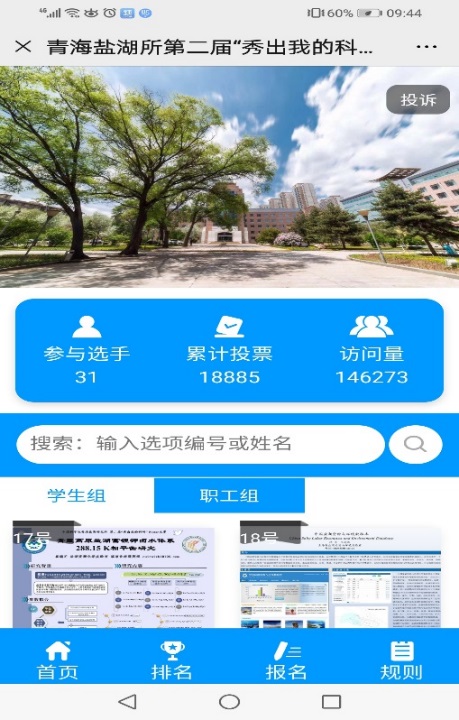 一年之計在于春,為了在疫情期間調動(dòng)科研人員參與研究活動(dòng)的積極性和主動(dòng)性,豐富大家的科研生活,提升大家的學(xué)術(shù)交流能力,激發(fā)大家的科研熱情,培養和提高青海鹽湖所研究生的學(xué)術(shù)素養,營(yíng)造良好的科研氛圍,促進(jìn)不同學(xué)科方向的交流合作。經(jīng)青海鹽湖所青年創(chuàng )新促進(jìn)會(huì )小組和人事教育處地認真籌備,青海鹽湖所第二屆“秀出我的科研”Poster大賽如期舉辦,這也是為突出研究所特色、深入開(kāi)展的一次勞動(dòng)和技能競賽。本屆大賽共有30余位青年職工和研究生以Poster的形式展示了他們的科研工作。由于疫情的影響,本屆大賽創(chuàng )新地采用了網(wǎng)絡(luò )投票和專(zhuān)家網(wǎng)絡(luò )評審相結合的方式進(jìn)行。