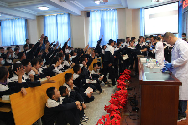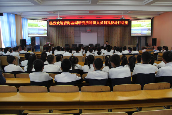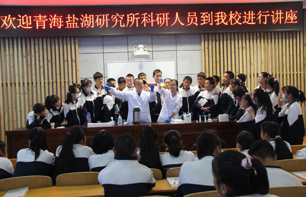 在校園,青海鹽湖所的博士科普團隊為中學(xué)生們講述了鹽湖故事,在《中國的鹽湖》科普講座中,形象生動(dòng)地講述了“什么是鹽湖”“鹽湖在哪里”“鹽湖里有什么用”,使同學(xué)們對青海的特色優(yōu)勢鹽湖資源有了初步的認識;開(kāi)展了神奇的化學(xué)小實(shí)驗,通過(guò)多彩化學(xué)、密碼顯形、黃金雨、催化放氧、銅樹(shù)銀枝、銀鏡反應等一系列精彩的科普實(shí)驗,緊緊抓住“變化”這一核心,以極具震撼力的方式向同學(xué)們展示了化學(xué)之美和科學(xué)之美,為同學(xué)們開(kāi)啟科學(xué)世界的大門(mén),激起他們探索科學(xué)世界的興趣;醫療專(zhuān)家為同學(xué)們現場(chǎng)普及家庭急救知識和新冠疫情預防知識,現場(chǎng)演示了心肺復蘇方法、正確的洗手方法及注意事項。無(wú)論是小實(shí)驗還是急救現場(chǎng)演示,同學(xué)們踴躍主動(dòng),興致勃勃,教室里不時(shí)發(fā)出陣陣驚嘆聲和掌聲,活動(dòng)取得了圓滿(mǎn)成功。
