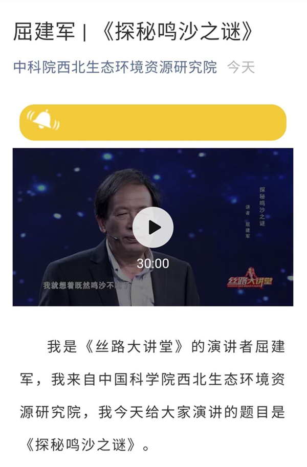 在西北研究院微信公眾號推送了屈建軍研究員主講的《探秘鳴沙之謎》科普報告,報告講述了其研究團隊通過(guò)長(cháng)年的科學(xué)研究,發(fā)現自然沙粒表面的多孔(坑)狀結構所構成的共鳴腔,是鳴沙發(fā)聲的關(guān)鍵所在。就像掏耳朵一樣,把堵在孔洞里的臟東西洗干凈,鳴沙就“復聲”了,實(shí)現了鳴沙的修復,成功復活了鳴沙自然現象,讓失聲的沙子再“唱歌”。
