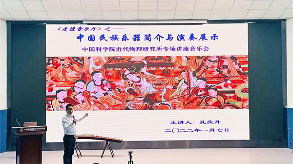本次論壇以《<走進(jìn)音樂(lè )廳>之中科院近代物理所新年民樂(lè )專(zhuān)場(chǎng)講座》為主題,報告人孔慶丹教授來(lái)自于西北師范大學(xué)音樂(lè )學(xué)院,報告人詳細介紹了包括笛、嗩吶、笙、二胡、琵琶、柳琴、阮、箏等在內的多種傳統民間樂(lè )器,同時(shí)配以現場(chǎng)演奏的方式,使得大家認識欣賞樂(lè )器的同時(shí)也深入了解了各類(lèi)民樂(lè )的表現形式以及音樂(lè )廳文化,對民樂(lè )有了更加立體、直觀(guān)的認識。報告結束,大家就如何提高個(gè)人藝術(shù)修養以及對青少年的音樂(lè )啟蒙教育等問(wèn)題與主講人進(jìn)行了熱烈的探討和交流。