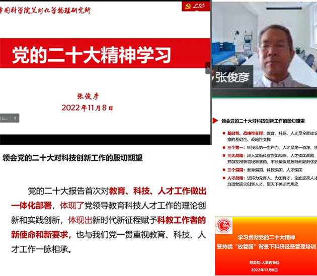 為進(jìn)一步落實(shí)國務(wù)院辦公廳印發(fā)的《關(guān)于改革完善中央財政科研經(jīng)費管理的若干意見(jiàn)》(以下簡(jiǎn)稱(chēng)《若干意見(jiàn)》)(國辦發(fā)〔2021〕32號)精神,加強科研財務(wù)助理對國家財經(jīng)政策和研究所規章制度的深入了解,提高科研經(jīng)費管理水平,有效減輕科研人員事務(wù)性負擔,11月8日,中國科學(xué)院蘭州化學(xué)物理研究所舉辦了2022年第二期科研財務(wù)助理培訓班。研究所科研財務(wù)助理、課題組經(jīng)費報銷(xiāo)及管理人員、直接管理經(jīng)費的項目負責人等130余人參加培訓。財務(wù)處處長(cháng)陳建主持會(huì )議。
