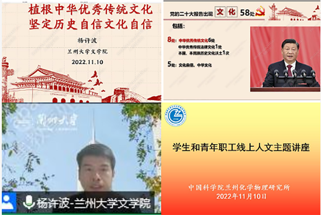 為深入貫徹落實(shí)黨的二十大精神,進(jìn)一步教育引導廣大研究生和青年職工堅定文化自信,弘揚中華優(yōu)秀傳統文化,11月10日,中國科學(xué)院蘭州化學(xué)物理研究所舉辦了研究生和青年職工線(xiàn)上人文主題講座。全所研究生、課題生和青年職工430余人參加講座。
