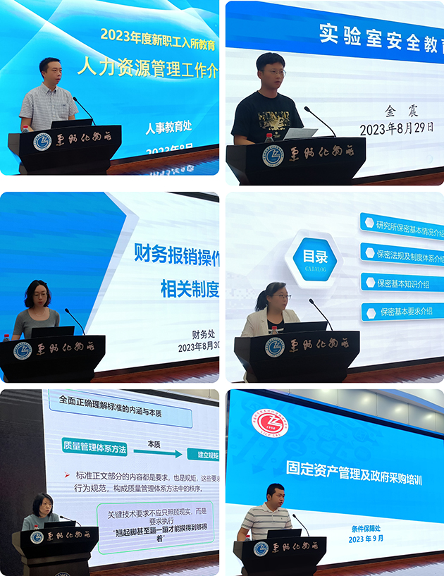 此次教育培訓分為業(yè)務(wù)培訓和專(zhuān)題培訓,業(yè)務(wù)培訓主要由黨委辦公室、所務(wù)辦公室、科研與規劃處、人事教育處、財務(wù)處、條件保障處、公共技術(shù)中心等分別就黨建、檔案管理、網(wǎng)絡(luò )安全、論文發(fā)表審查、人事人才、財務(wù)制度與報銷(xiāo)管理流程、固定資產(chǎn)管理與政府采購、公共設施使用與行為規范、公共平臺建設與運維等方面進(jìn)行了介紹。專(zhuān)題培訓主要包括實(shí)驗室安全教育、保密教育、質(zhì)量管理體系建設與運行、館藏文獻與數據庫應用等。