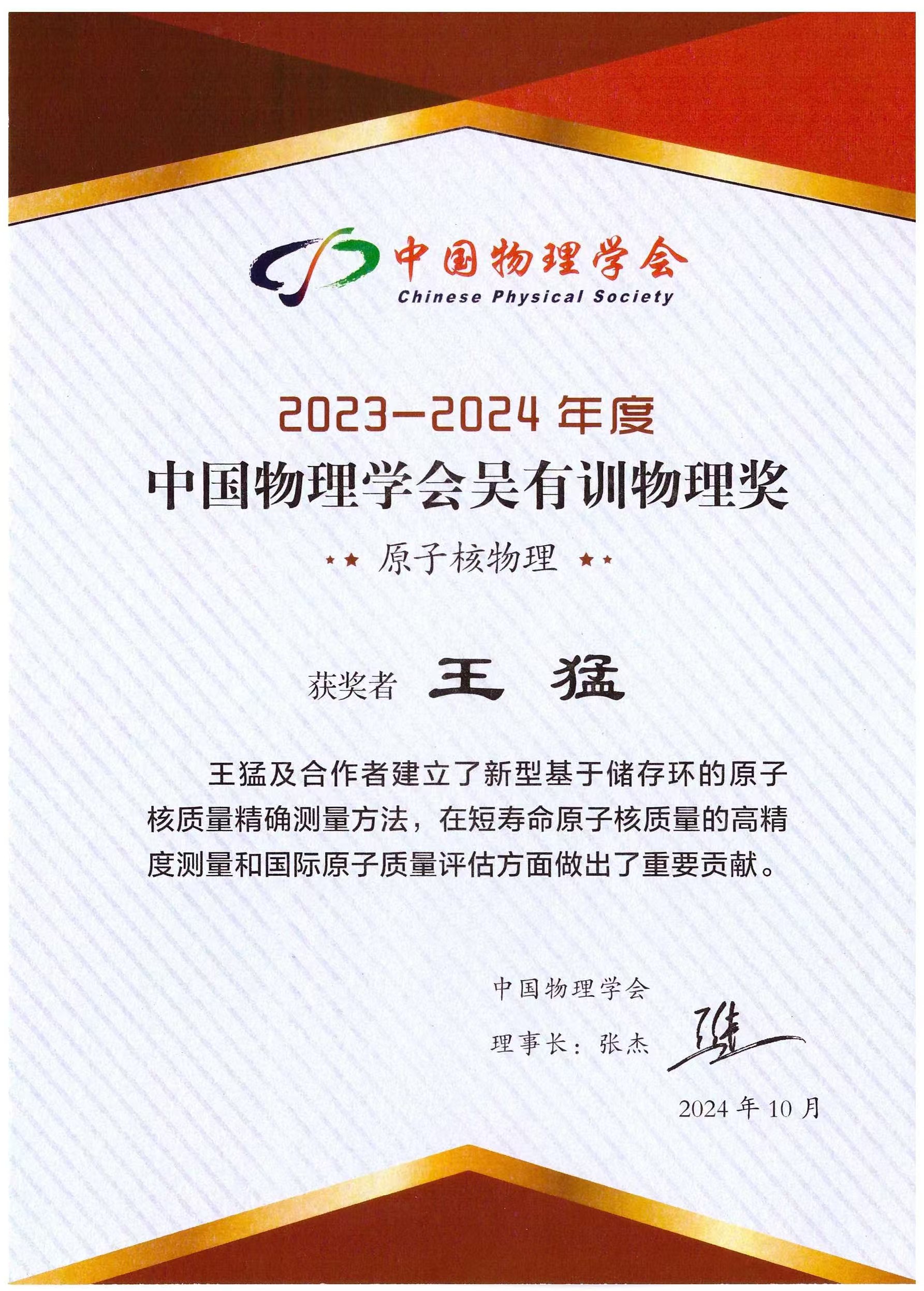 10月10日至13日,中國物理學(xué)會(huì )2024秋季學(xué)術(shù)會(huì )議在海南國際會(huì )展中心舉行。開(kāi)幕式上舉行了2023-2024年度中國物理學(xué)會(huì )五項物理獎頒獎儀式,中國科學(xué)院近代物理研究所副所長(cháng)王猛研究員榮獲吳有訓物理獎(原子核物理)。?