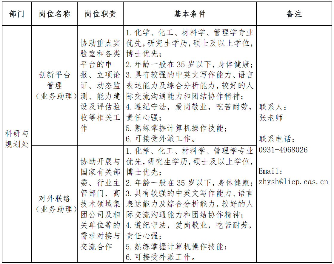 根據中國科學(xué)院蘭州化學(xué)物理研究所工作需要,本著(zhù)“按需設崗、公開(kāi)招聘、競爭上崗、擇優(yōu)聘用”的原則,現公開(kāi)招聘管理與支撐部門(mén)崗位工作人員(項目聘用)2名。