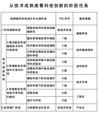 國內外創(chuàng )新發(fā)展實(shí)踐證明,科學(xué)技術(shù)與創(chuàng )新在不同階段、不同環(huán)節對資源投入和制度環(huán)境有不同的需求,其價(jià)值創(chuàng )造需基于不同主體的資源投入與風(fēng)險承擔進(jìn)行合理利益分配,使相關(guān)主體的創(chuàng )新活動(dòng)和資源投入得到有效激勵、持續銜接和深入推進(jìn)。目前許多國家在科研管理中引入了技術(shù)成熟度(TRL)指標,這一指標將技術(shù)發(fā)展分為九個(gè)等級,政府將根據技術(shù)發(fā)展狀態(tài)確定支持政策。我們參考TRL評價(jià)將創(chuàng )新鏈延展為五個(gè)階段,與主要任務(wù)和通常理解相匹配,如下表所示:
