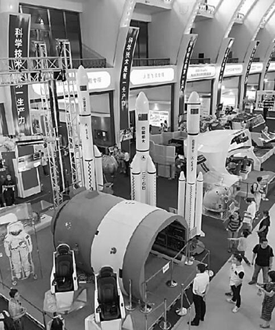 北京,參觀(guān)者在國家“十二五”科技創(chuàng )新成就展上參觀(guān)天宮模擬體驗艙和長(cháng)征運載火箭等展品。光明圖片/視覺(jué)中國