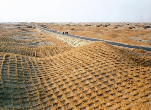 實(shí)際上,草方格最早應用于我國第一條沙漠鐵路包蘭鐵路的建設中。在寧夏沙坡頭地區火車(chē)穿越了騰格里沙漠,在科技工作者和當地群眾的共同努力下,麥草方格編成的巨網(wǎng)最終成功縛住了“沙龍”。沙坡頭因此被稱(chēng)為“草方格的故鄉”。如今,一把鐵鍬,一捆麥草,一片草方格,沙坡頭實(shí)現了黃沙變綠洲的嬗變,騰格里沙漠中神奇地出現了一條連綿延伸的“綠帶”。